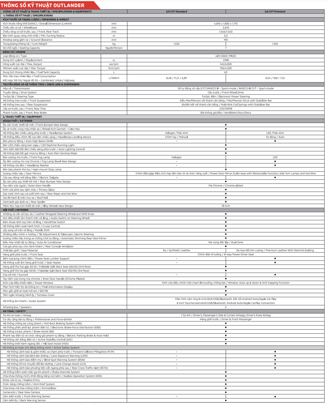 | Thông số kỹ thuật | Mitsubishi Outlander 2.0 Premium |